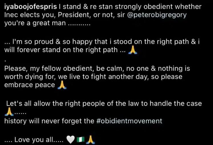 “I stand & re stan strongly obedient whether Inec elects you, President, or not, sir @peterobigregory you’re a great man..I’m so proud & so happy that I stood on the right path & I will forever stand on the right path … 🙏