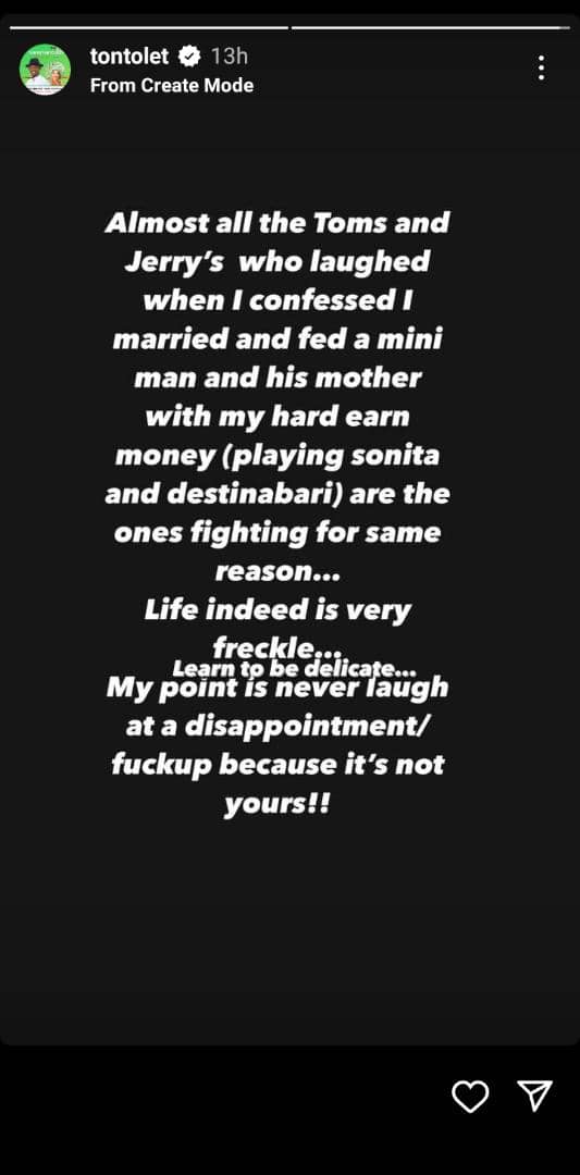 Tonto in a post on her Instagram page stated that almost all those who laughed at her when she claimed that she married a mini man, fed him and his mother, are now having issues in their own marriage.