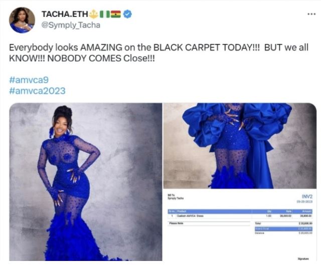 Speaking on her outfit, Tacha revealed that the blue dress, designed by celebrity designer, Tolu Bally, cost her a whopping $20,000.