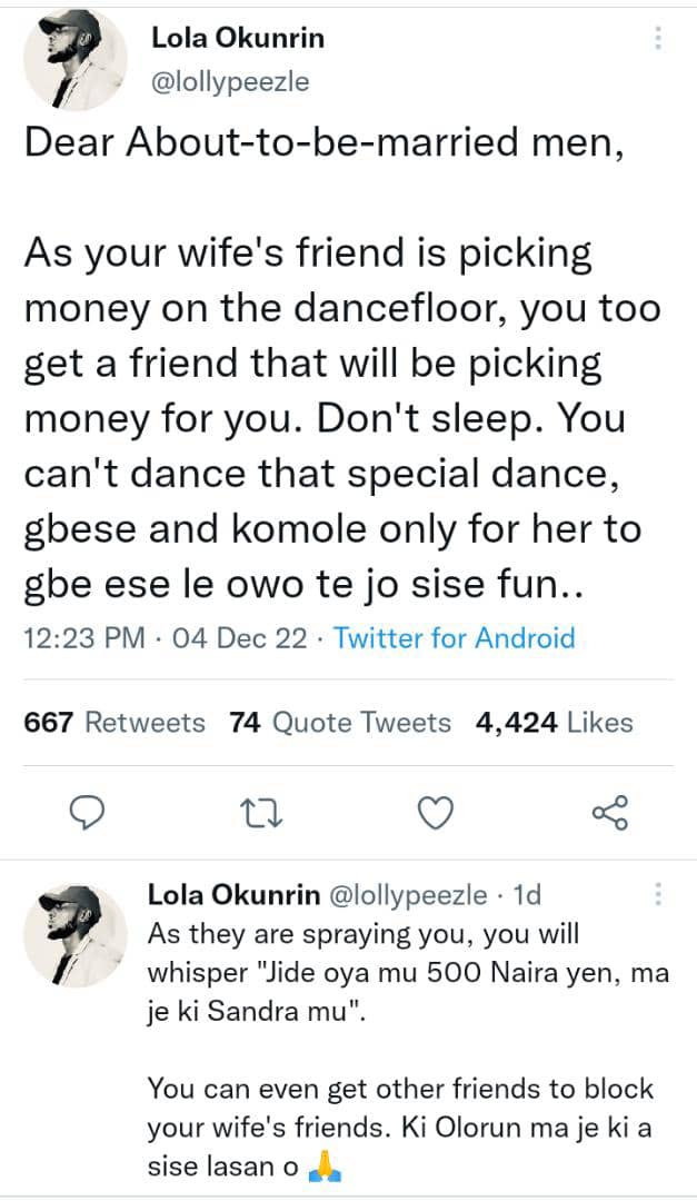 As your wife’s friend is picking money on the dancefloor, you too get a friend that will be picking money for you. Don’t sleep. You can’t dance that special dance, gbese and komole only for her to gbe ese le owo te jo sise fun..As they are spraying you, you will whisper “Jide oya mu 500 Naira yen, ma je ki Sandra mu”.