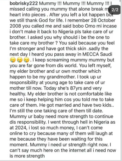 “I went through hell in Nigeria in 2024, I lost so much money. I can’t come online to cry because many of them will laugh at me… Mummy, I need your strength right now,” he wrote.