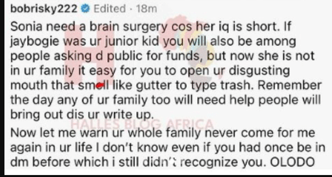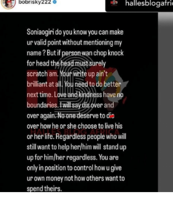 “Soniaogiri do you know you can make ur valid point without mentioning my name ? But if person wan chop knock for head the head must surely scratch am. Your write up ain’t brilliant at all. You need to do better next time. Love and kindness have no boundaries. I will say dis over and over again. No one deserve to dis over how he or she choose to live his or her life. Regardless people who will still want to help her/him will stand up up for him/her regardless. You are only in position to control how u give ur own money not how others want to spend theirs.
