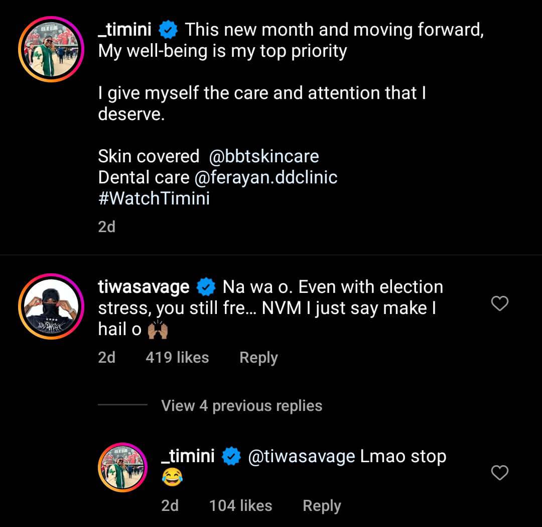 Afrobeats singer Tiwa Savage was recently left raving over Nigerian actor Timi Egbuson’s most recent social media posts.