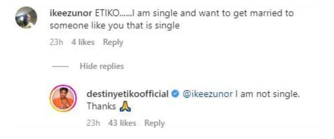 “@ikeezunor I am not single. Thanks 🙏,” she wrote.