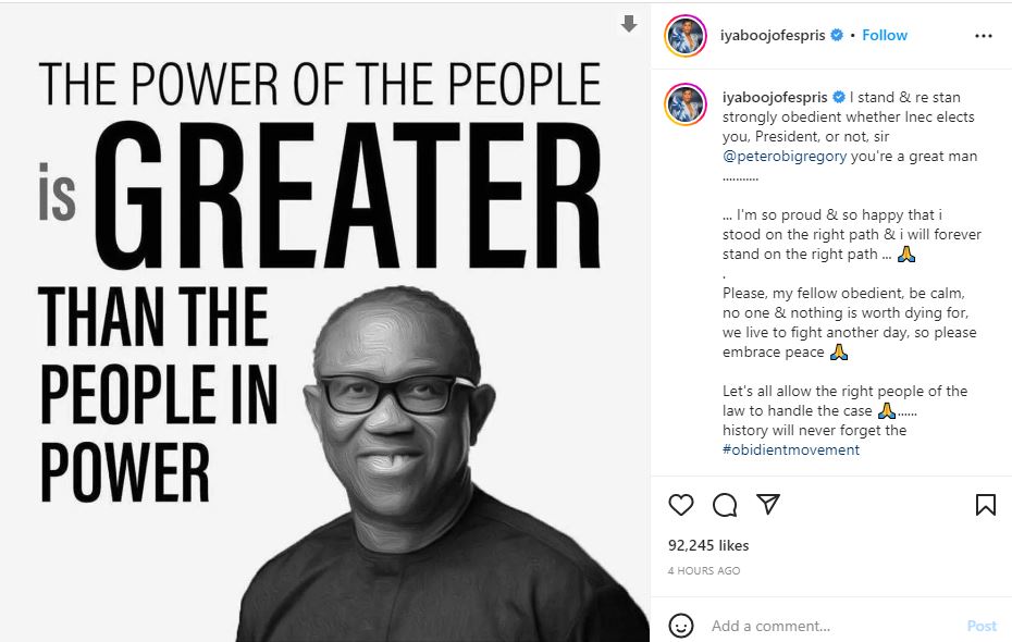 Iyabo Ojo who supports Labour Party’s presidential candidate, Peter Obi, boldly declared her stance while at the same time addressing tribalistic bigots.