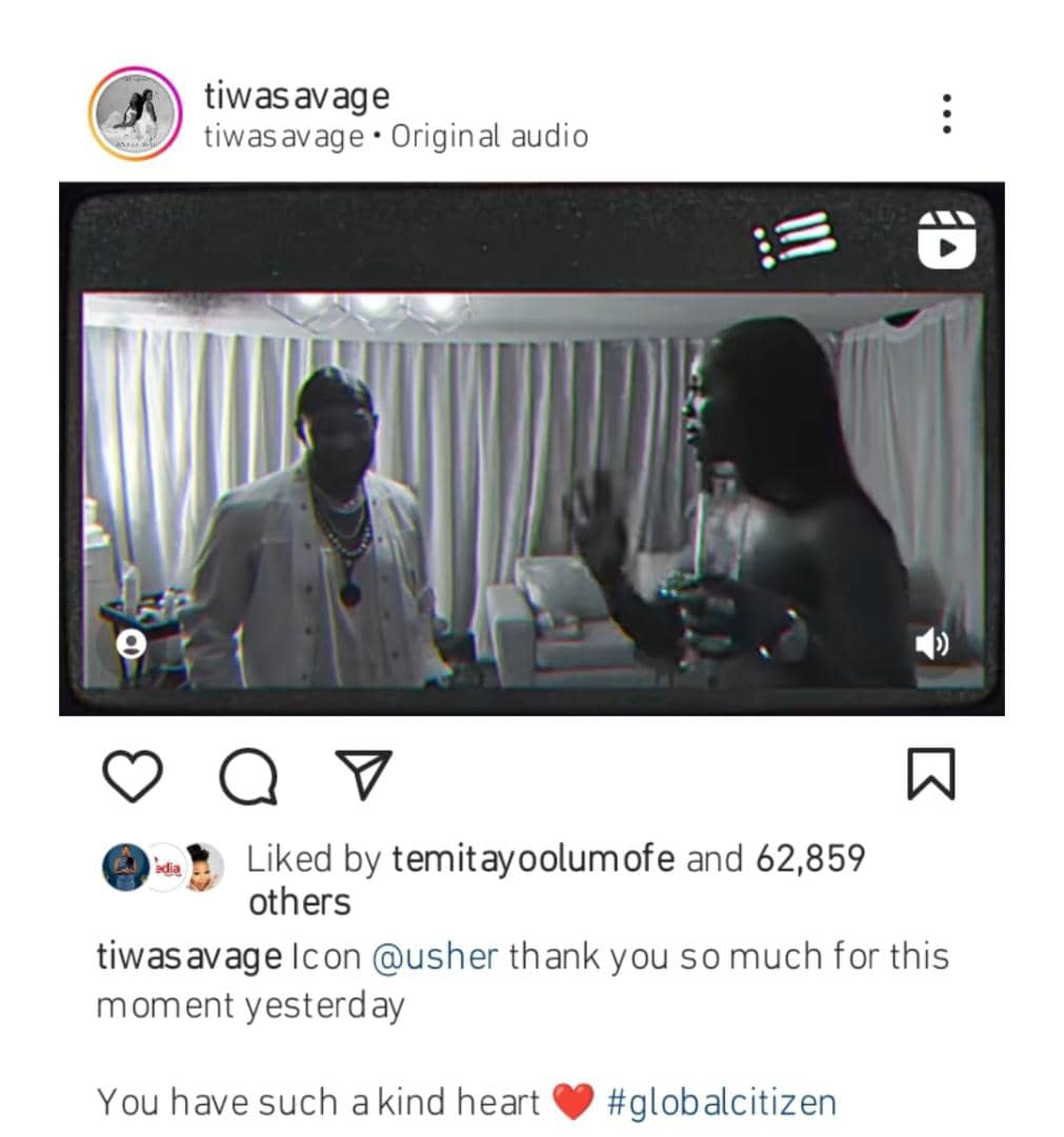 Award winning singer Tiwa Savage has eulogised American singer, Usher.