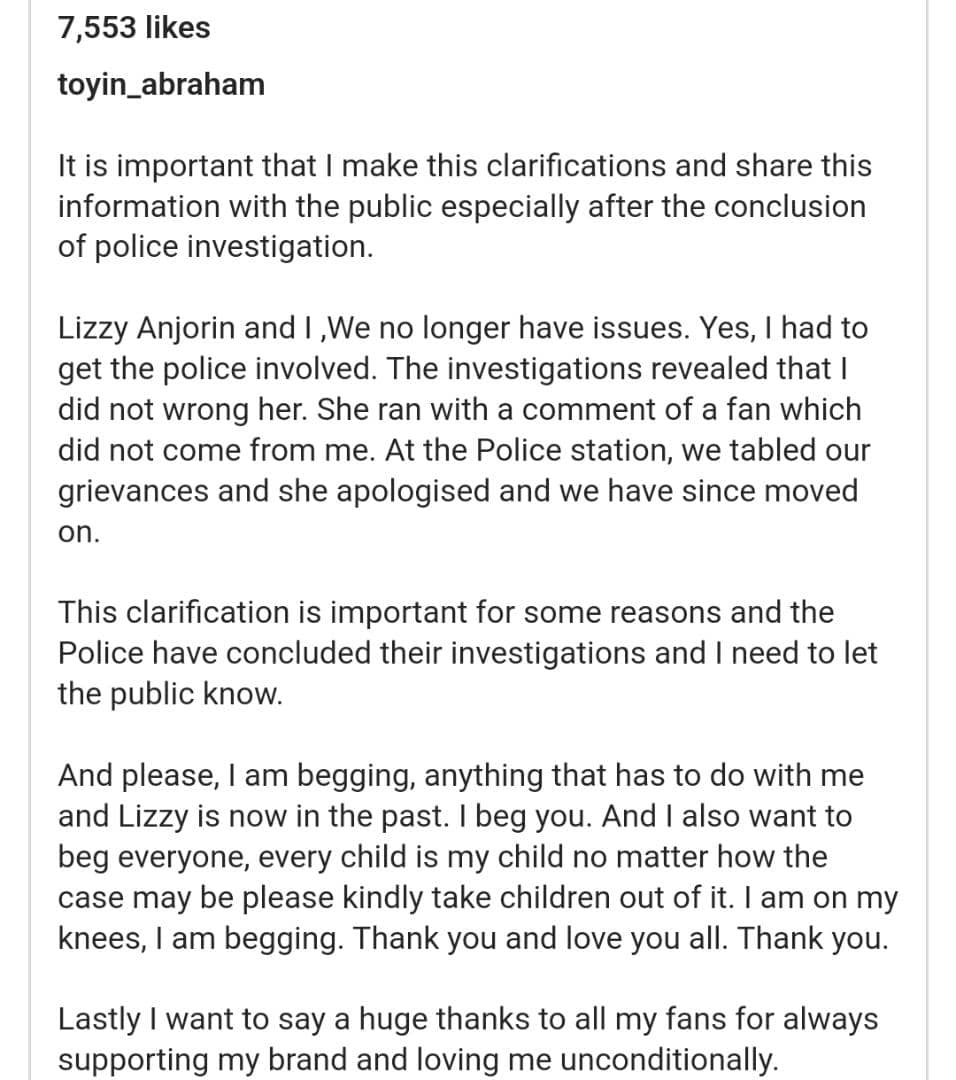 Well, in a new development, Toyin has revealed that all is now well after she got the police involved. The Alakada star explained that a police investigation revealed that she did not wrong her and that Anjorin only ran with a comment that didn’t come from her. Also in the note, Toyin added that after their matter was tabled, Anjorin apologised and they have moved on.