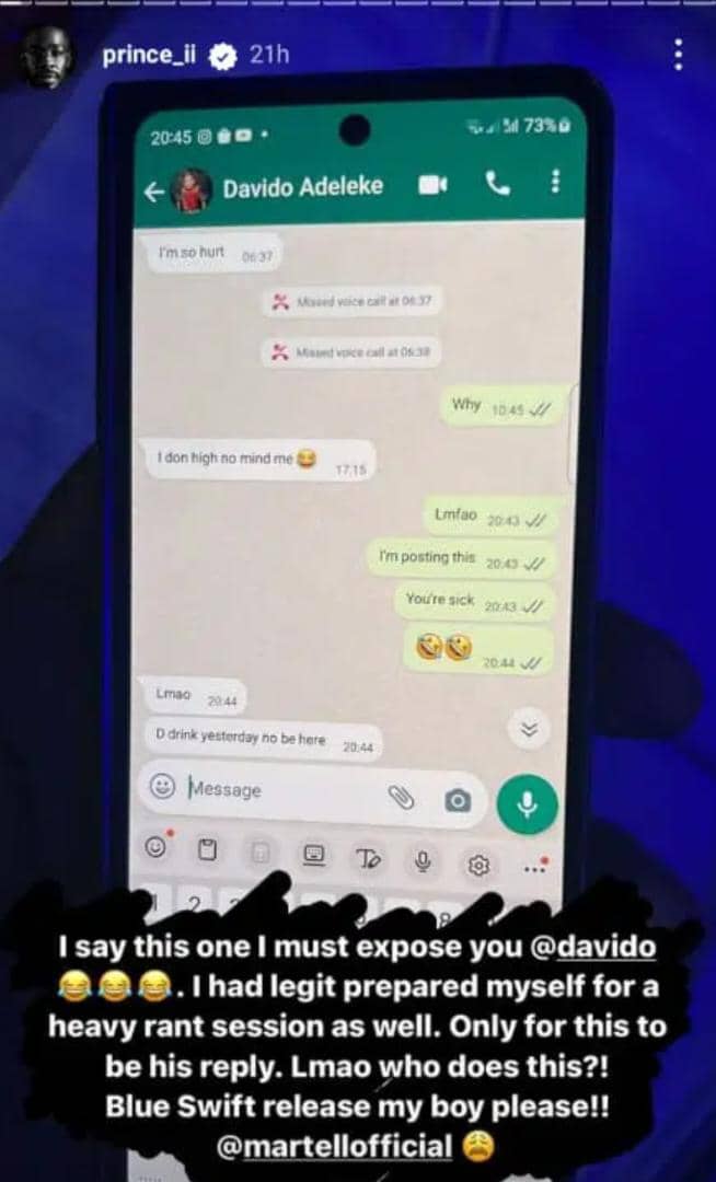 “I say this one I must expose you @davido. I had legit prepared myself for a heavy rant session as well. Only for this to be his reply. Lmao, who does this?! Blue Swift release my boy please!! @martellofficial.”