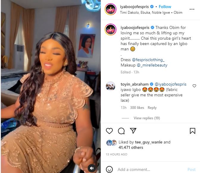 “Thanks Obim for loving me so much & lifting my spirit…. Chai this Yoruba girl’s heart had finally been captured by an Igbo man”.