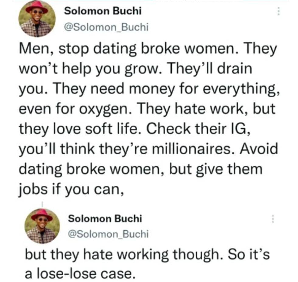 “Men, stop dating broke women. They won’t help you grow. They’ll drain you. They need money for everything, even for oxygen. They hate work, but they love soft life. Check their IG, you’ll think they’re millionaires. Avoid dating broke women, but give them jobs if you can, but they hate working though. So it’s a lose-lose case.”