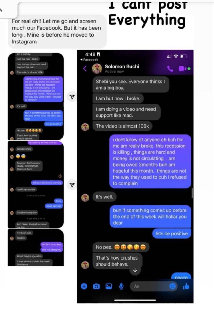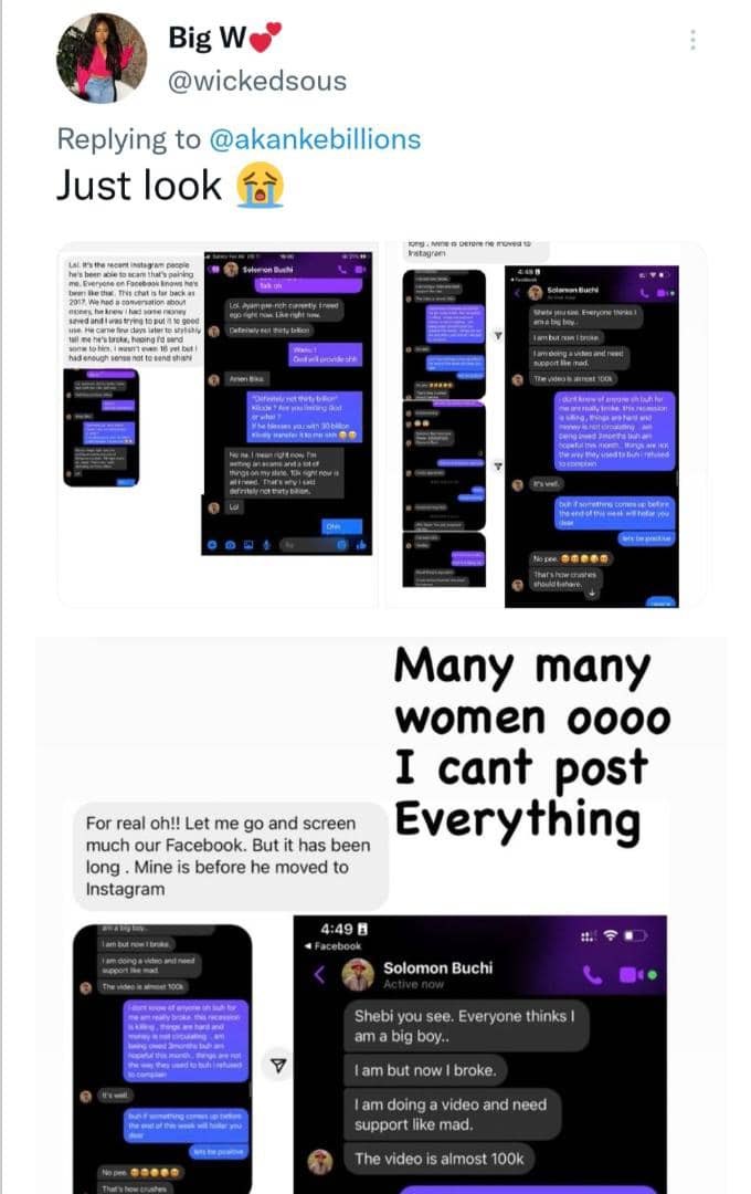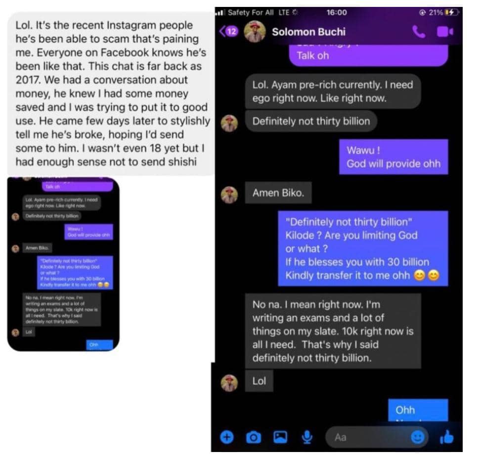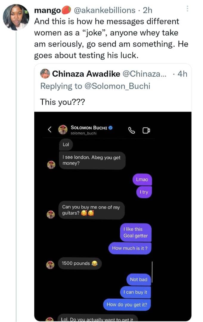 Amid the uproar caused by the tweet, some women began sharing chats purportedly showing Solomon Buchi stylishly begging them for money and material things.
