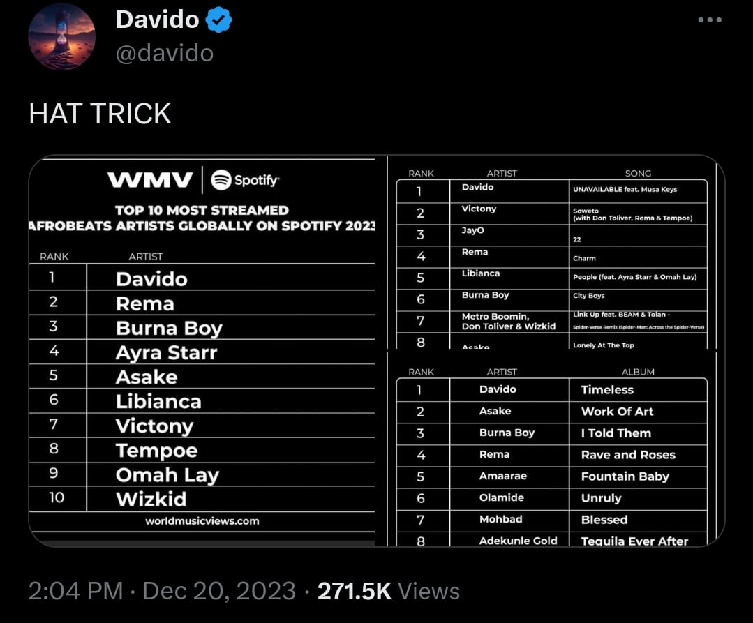 In the said post, which has garnered attention, Davido shared three charts. In one, he emerged as the most streamed Afrobeat artist globally for 2023.