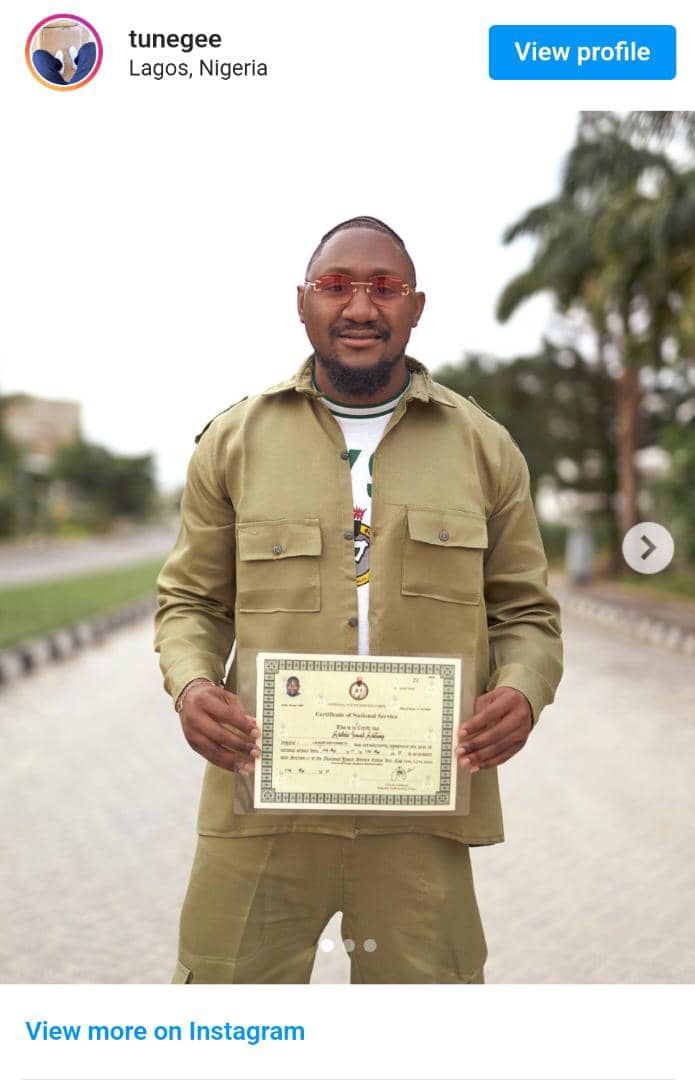 However, in a recent post, Tunji Adeleke shares photos of himself in his NYSC dress, showing of his certificate of national service (CNS) as he completes the mandatory one-year service to his fatherland.