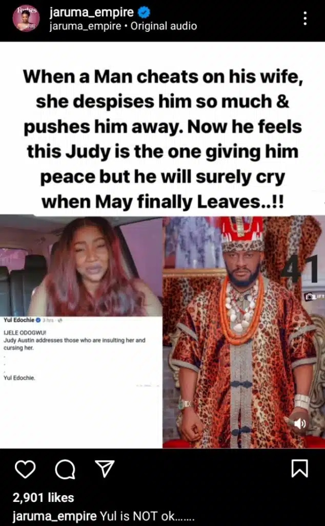 Reacting to the ongoing drama, Jaruma has slammed Yul Edochie for disrespecting his first wife, May Edochie weeks after losing their first child.
