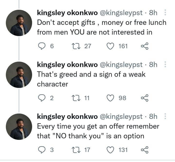 Relationship counselor, Pastor Kingsley Okonkwo has advised ladies not to accept gifts, money or free lunch from men they don’t have interest to date.