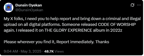 “My X folks, I need you to help report and bring down a criminal and illegal upload on all digital platforms. Someone released CODE OF WORSHIP again. I released it on THE GLORY EXPERIENCE album in 2022z