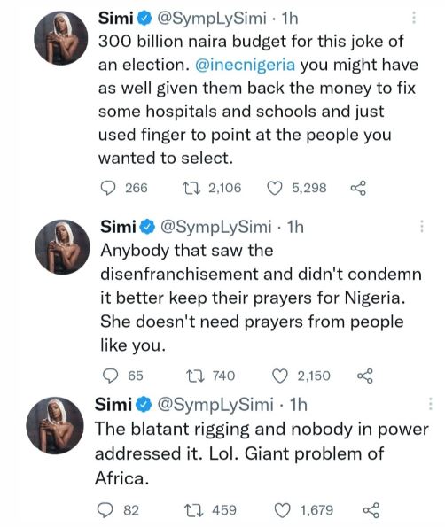 She made this known via her Twitter handle while calling out the Independent National Electoral Commission (INEC) on Monday, March 20.