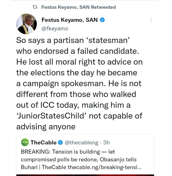 The Minister of State for Labour and Employment, Festus Keyamo, has slammed former President Olusegun Obasanjo, who in an open letter to President Buhari condemned the procedure of the Presidential election held last Saturday, February 25.