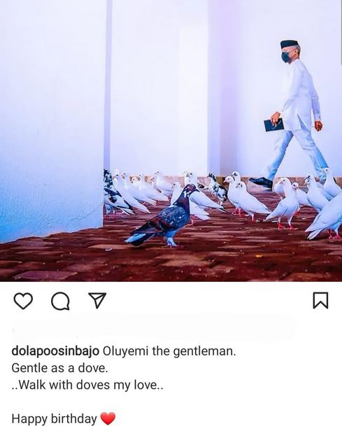 She shared a photo of him in white, walking among doves, and wrote: “Oluyemi the gentleman. Gentle as a dove…Walk with doves my love.. Happy birthday.”