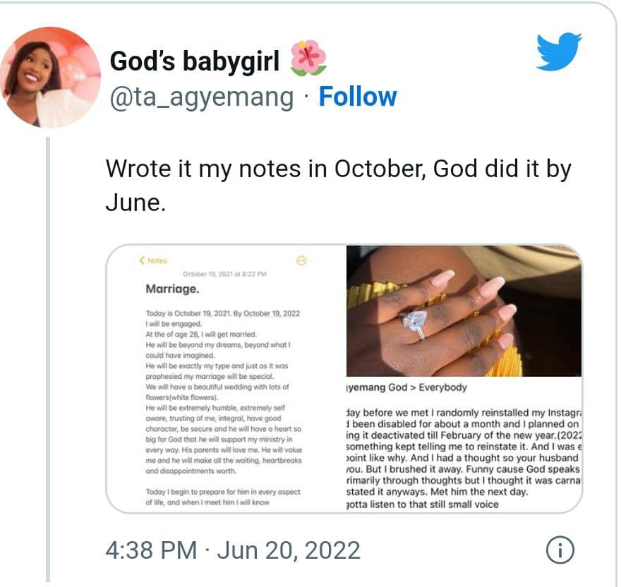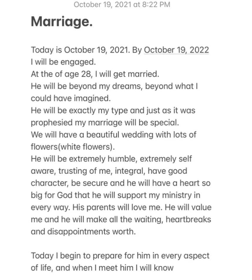 The lady took to social media to share a screenshot of the prophesy she wrote in October 2021 when she was single to stupor and didn’t have a man in her life.