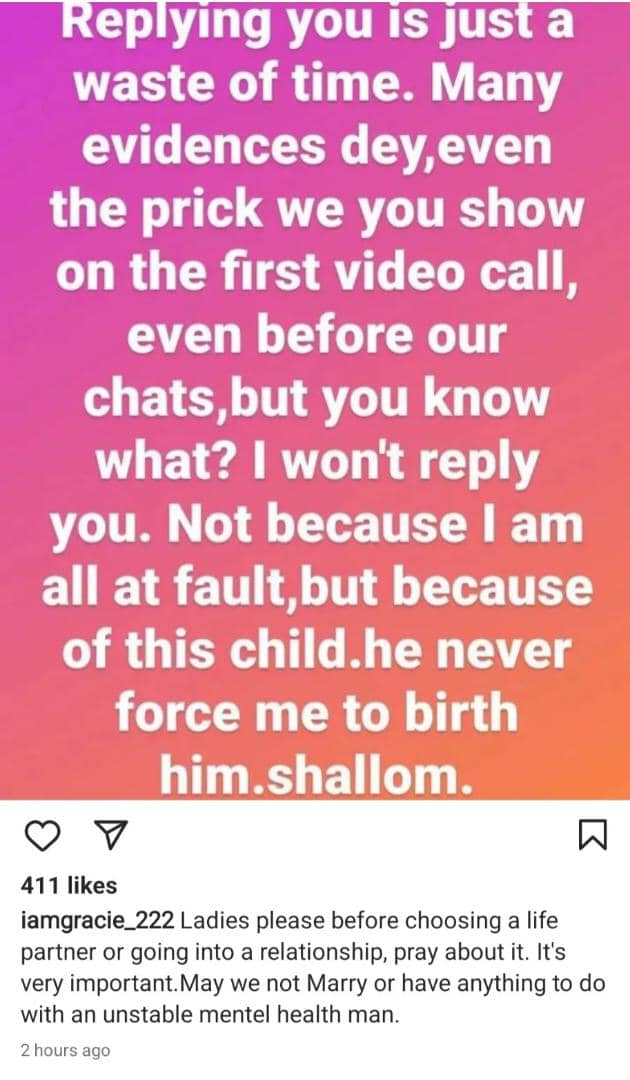 Addressing his claims that she slid into his DM first, the mother of one stated that it’s not true as they had a video call prior to the chat where he showed her his manhood.