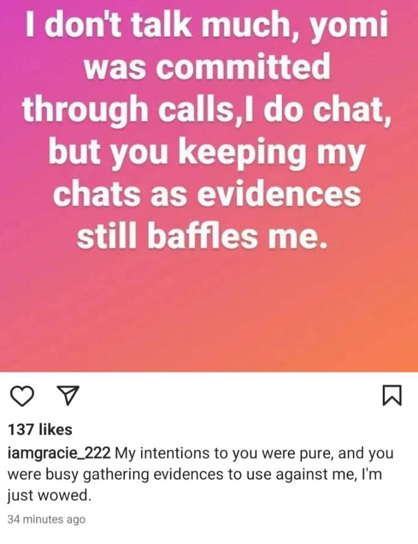 Nollywood actress, Grace Amarachi has fired back at her baby daddy, actor Yomi Fabiyi, after he countered her allegations against him.