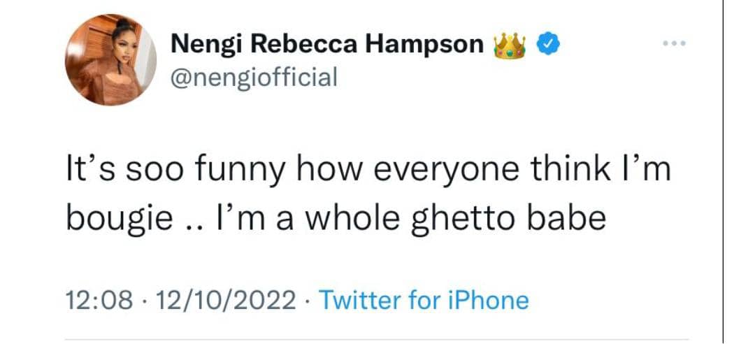 The reality TV star, in a post via her verified Twitter page on Wednesday afternoon said she’s a ghetto babe.