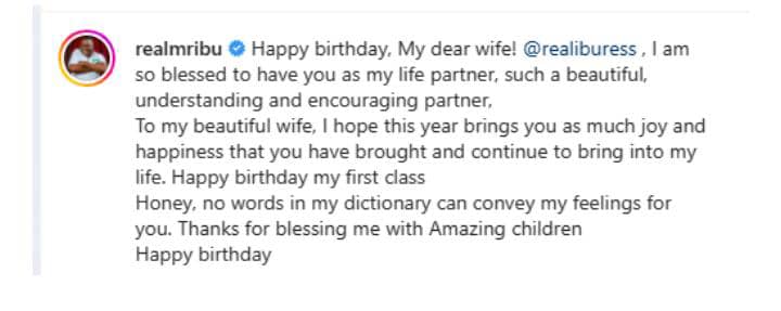 “Happy birthday, My dear wife! @realiburess. I am so blessed to have you as my life partner. Such a beautiful, understanding and encouraging partner. To my beautiful wife, I hope this year brings you as much joy and happiness that you have brought and continue to bring into my life. Happy birthday my first class.