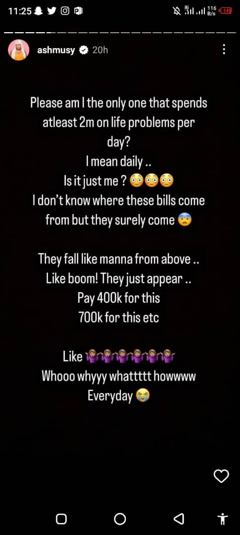 Ashmusy who made this known in a post on her Instagram page, stated that she doesn’t know where these daily bills she pays comes from. According to her they just emerge from nowhere.