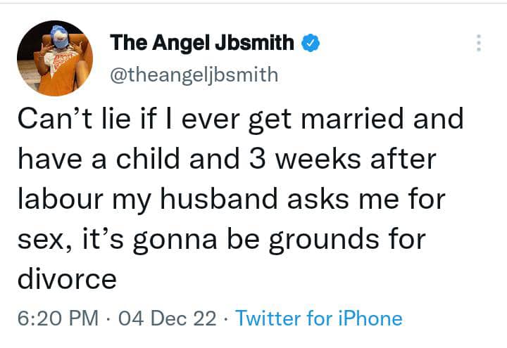 Angel in a tweet stated that if she ever gets married and have a child, if her husband demand sex , three weeks after she survives the labor room she would divorce him.