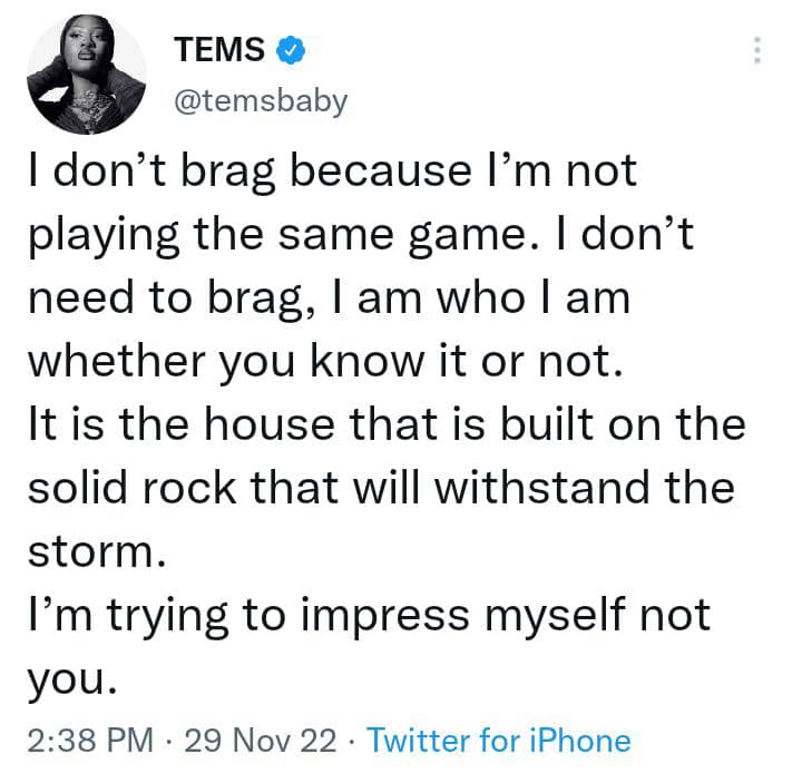 Sensational singer, Tems, has revealed that she is not trying to impress anyone with her lifestyle. She stated that she is only trying to impress herself.