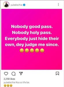 “Nobody good pass. Nobody Holy pass. Everybody Just hide their own, dey judge me since”.