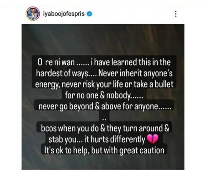 “O re ni wan…. I have learned this in the hardest ways… Never inherit anyone’s energy, never risk your life or take a bullet for no one & nobody.