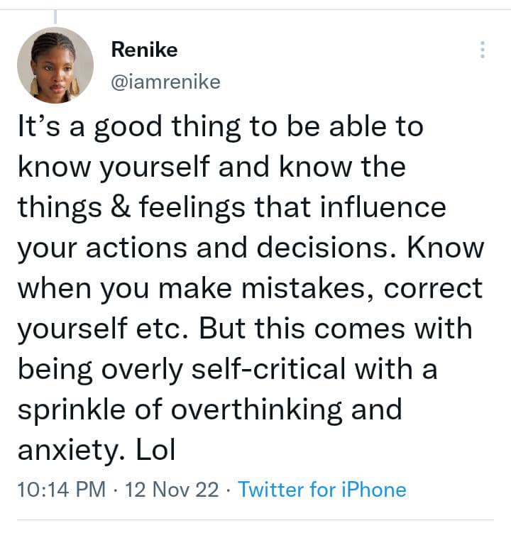 Renike in a tweet on the bird app stated that people should study and know themselves, their feelings and things that influence them.