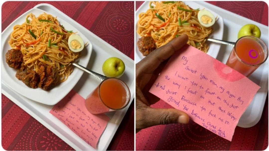 A beautiful Ghanaian lady has spiked controversies on the Ghanaian internet after preparing an expensive food with a short note on top to thank her boyfriend for giving her a good sex.