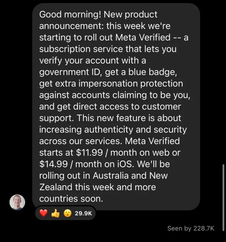 Zuckerberg positions it as “extra impersonation protection” against accounts claiming to be other accounts and will also allow those who pay for the subscription to get direct access to customer support.