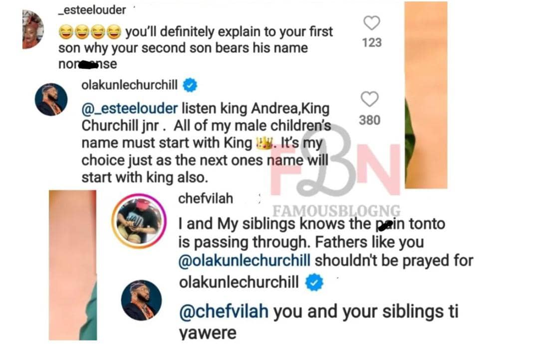 “@_esteelouder listen king Andrea,King Churchill jnr. All of my male children’s name must start with King. It’s my choice just as the next ones name will start with king also.” He said.