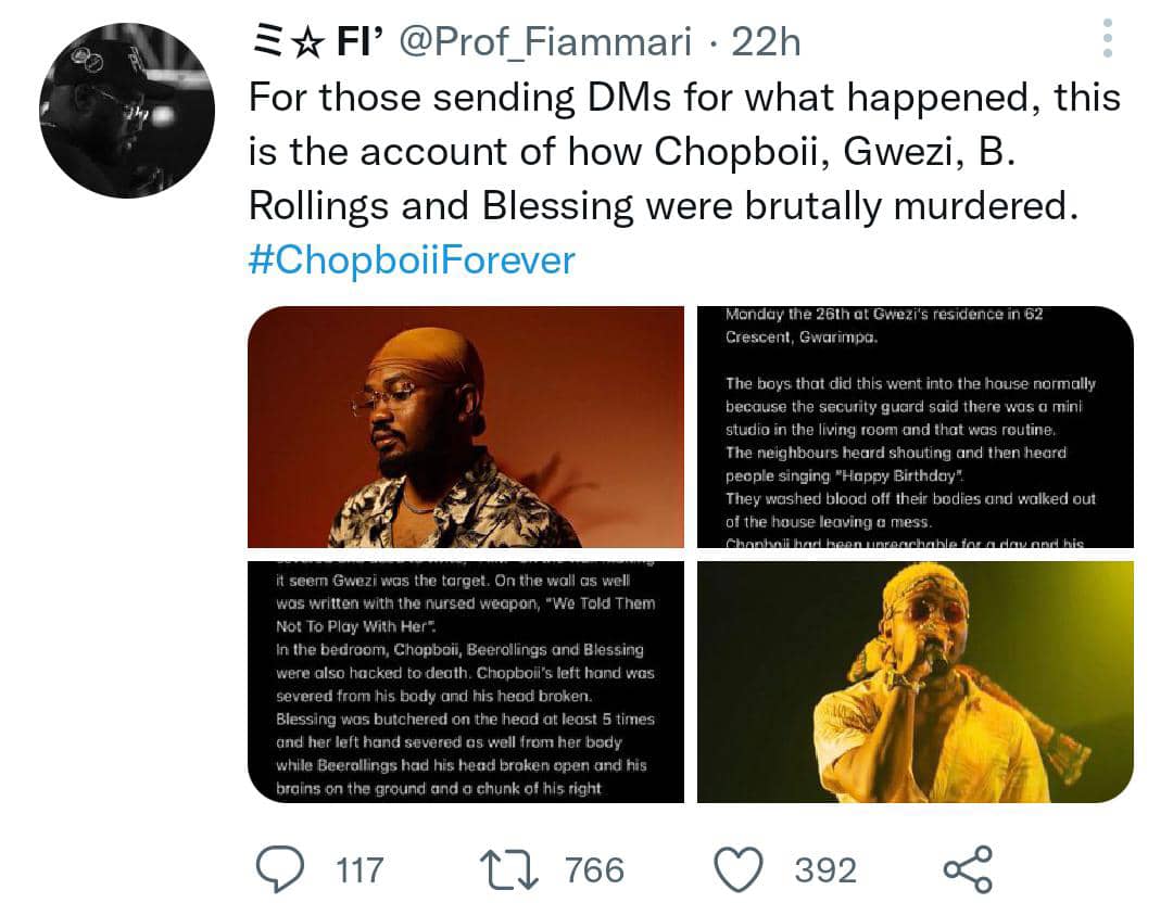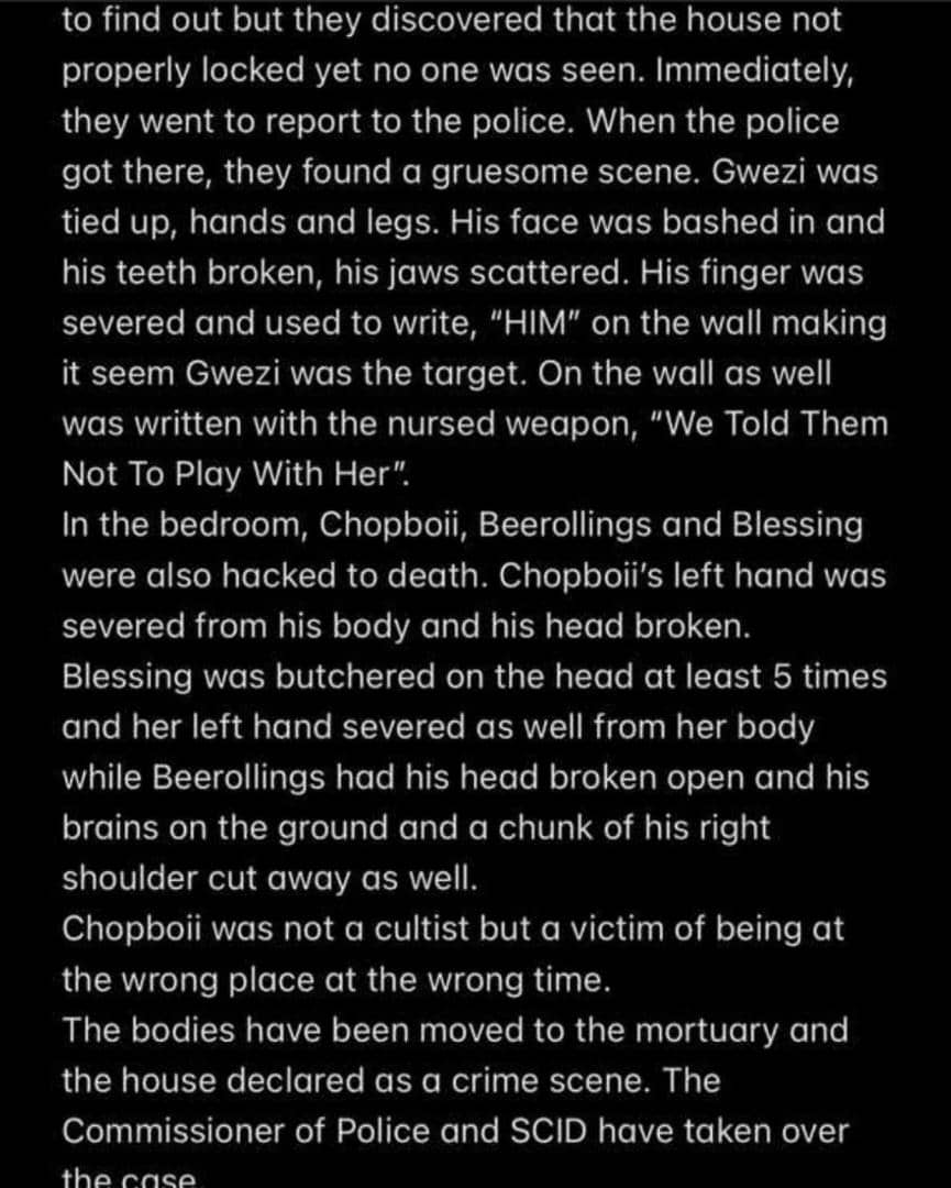 According to the friend, Chop Boi’s hands and legs were tied and his head was bashed, while Blessing was hacked to death, and Beerolings’ head was broken open and his brains were on the floor, according to the friend.