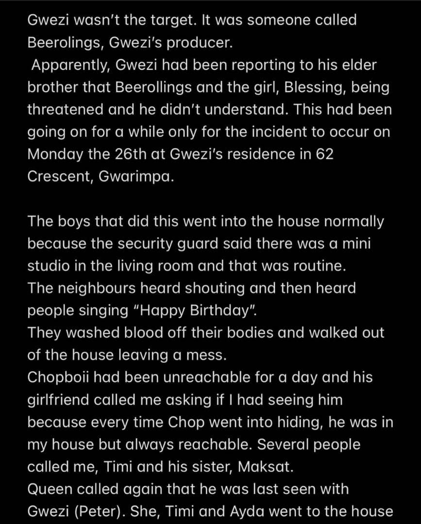 Giving details about the incident on Twitter, another friend of the deceased said the killers were allowed into the compound by the security guard because the producer has a mini studio in his living room and it was “routine” for people to come in.
