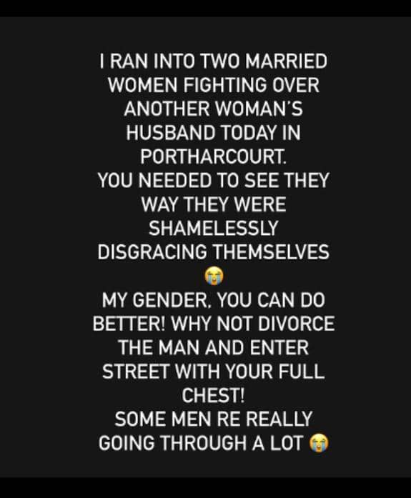 “I ran into two married women fighting over another woman’s husband today in Port Harcourt. You needed to see the way they were shamelessly disgracing themselves. My gender you can do better! why not divorce the man and enter streets with your full chests, some men are really going through a lot!”.