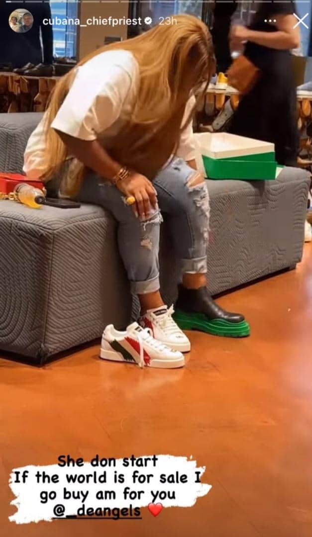 He shared a video of his wife trying on a sneakers and wrote, “She don start. If the world is for sale, I go buy am for you”.