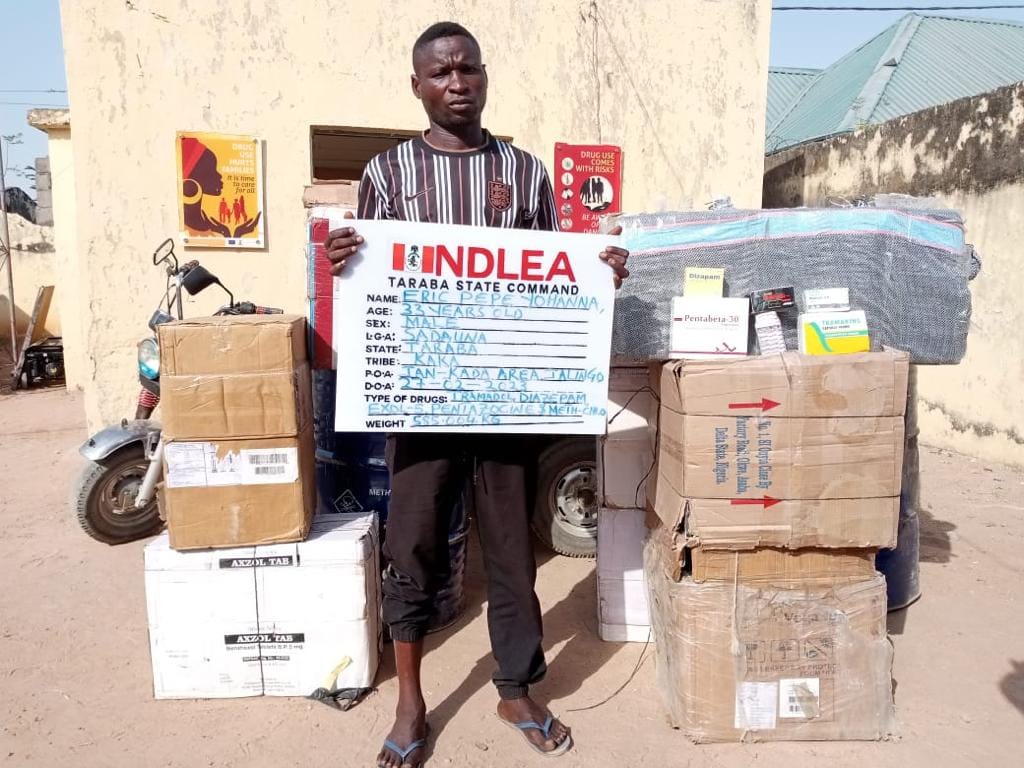 “No fewer than 778,190 pills of pharmaceutical opioids including tramadol and a drum of 270kg Methylene Chloride were recovered by operatives from a suspect, Eric Pepe Yohanna, 33, in Jalingo, Taraba state on Monday 27th Feb following credible intelligence. Also seized from him is a Daylong tricycle used in distributing the illicit substances.