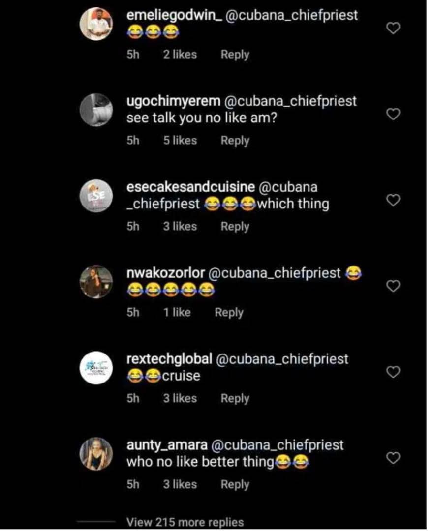 Nigerian socialite and celebrity barman, Pascal Chibuike Okechukwu, known better as Cubana Chief Priest garnered attention to himself after dropping a suggestive comment on gospel singer, Mercy Chinwo’s engagement post.
