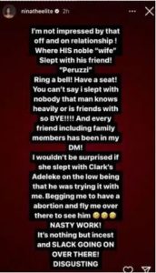 She accused Peruzzi of sleeping with Chioma. She further insinuated that Chioma might have also slept with Davido’s cousin Clark Adeleke because he has been pestering her to sleep with her as well.