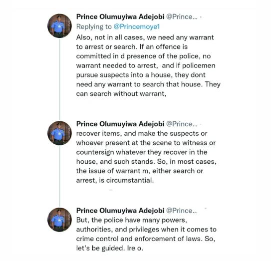 In a series of tweet, Adejobi pointed out that the police has the power to break in and out of any house if they have reasonable suspicion that a crime is being committed there.