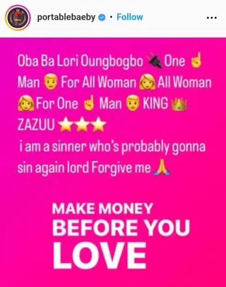 “Oba Ba Lori Oungbogbo. One Man For All Woman. All Woman For One Man KING 👑 ZAZUU. I am a sinner who’s probably gonna sin again lord Forgive me 🙏“, Portable wrote.