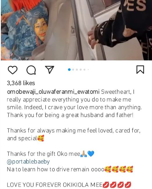 “Sweetheart, I really appreciate everything you do to make me smile. Indeed I crave your love more than anything. Thank you for being a great husband and father! Thanks for always making me feel loved, cared for, and special. Thanks for the gift Oko mee @portablebaeby Na to learn how to drive remain oooo. Love you forever okikiola mee”.