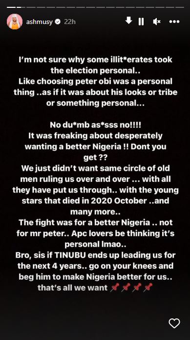 The fight was for a better Nigeria, not Mr. peter APC lovers be thinking it’s personal. So Bro. Sis, if Tinubu ends up leading us for the next four years, go on your knees and beg him to make Nigeria better for us; that is all we want.