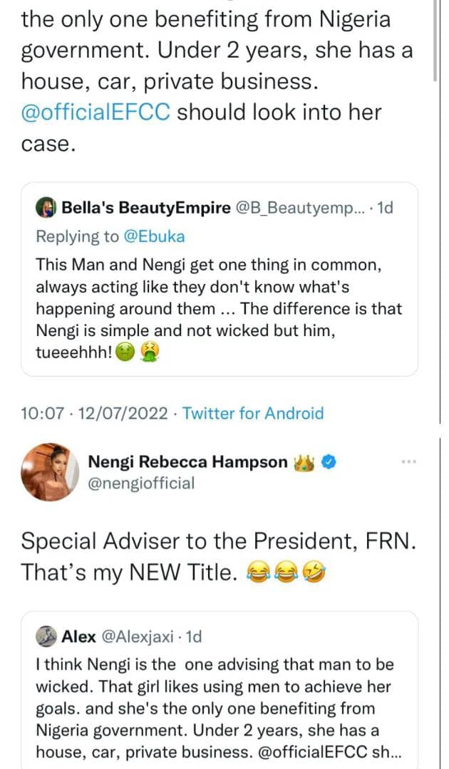 However, another Twitter user who seemed to have a beef with the reality show star, said he thinks Nengi is Buhari’s adviser because she has been ‘benefiting’ from the current administration.