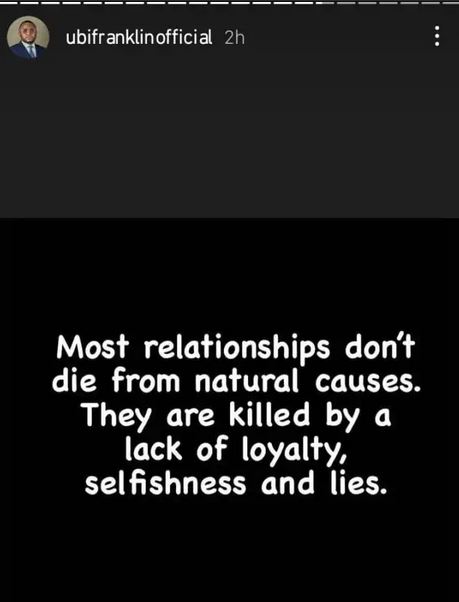 Ubi has now reacted to the story of Davido unfollowing him, he stated that relationships do not die from natural causes but from lack of loyalty and lies.